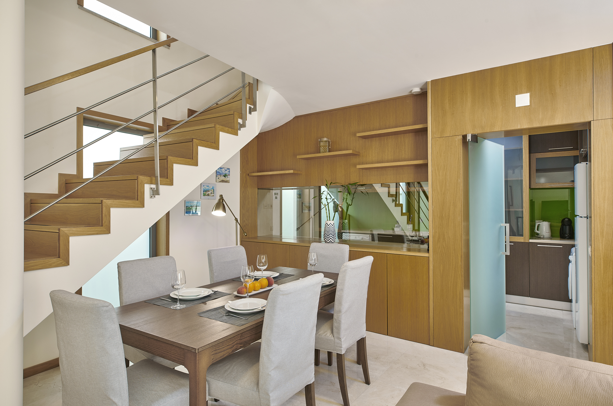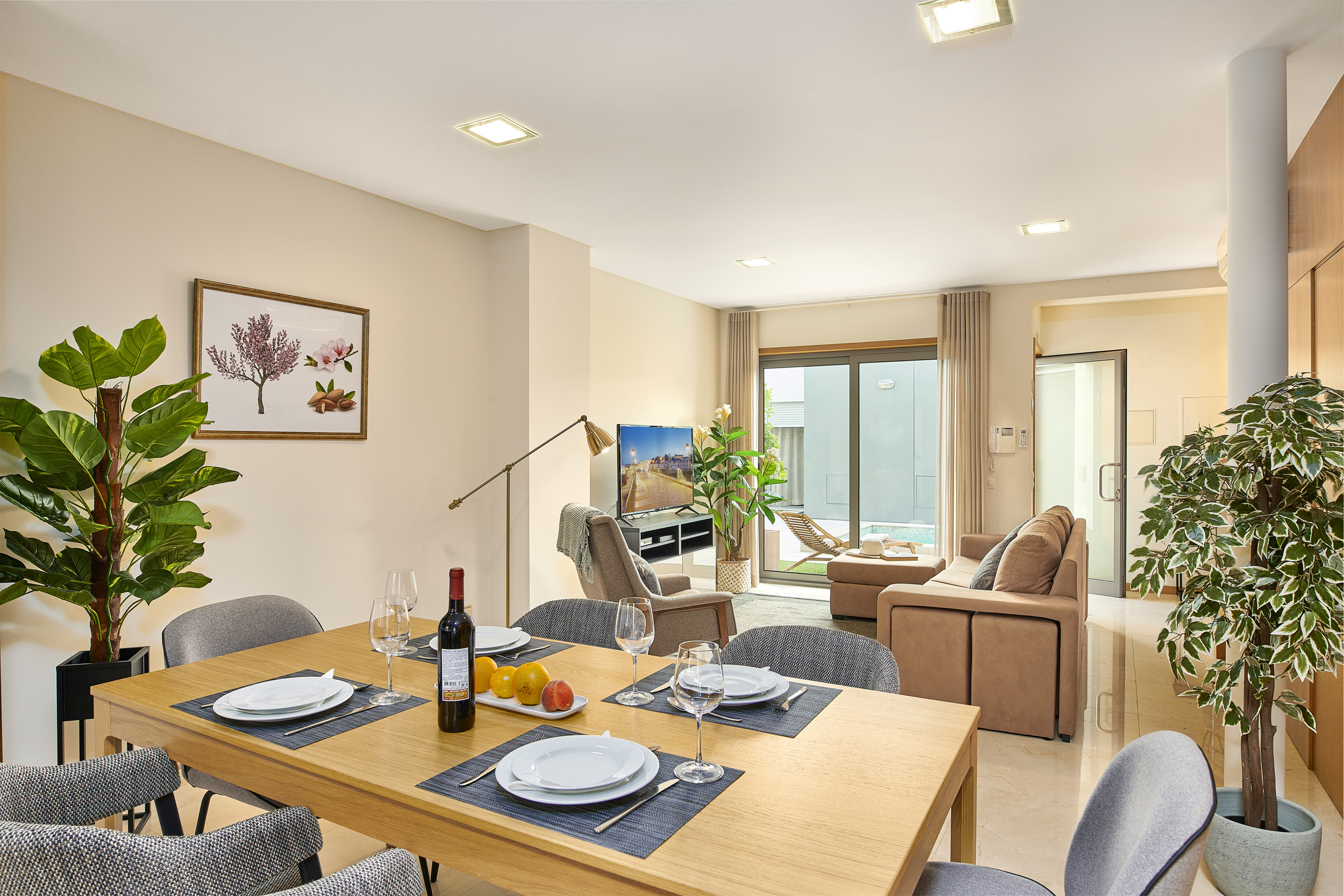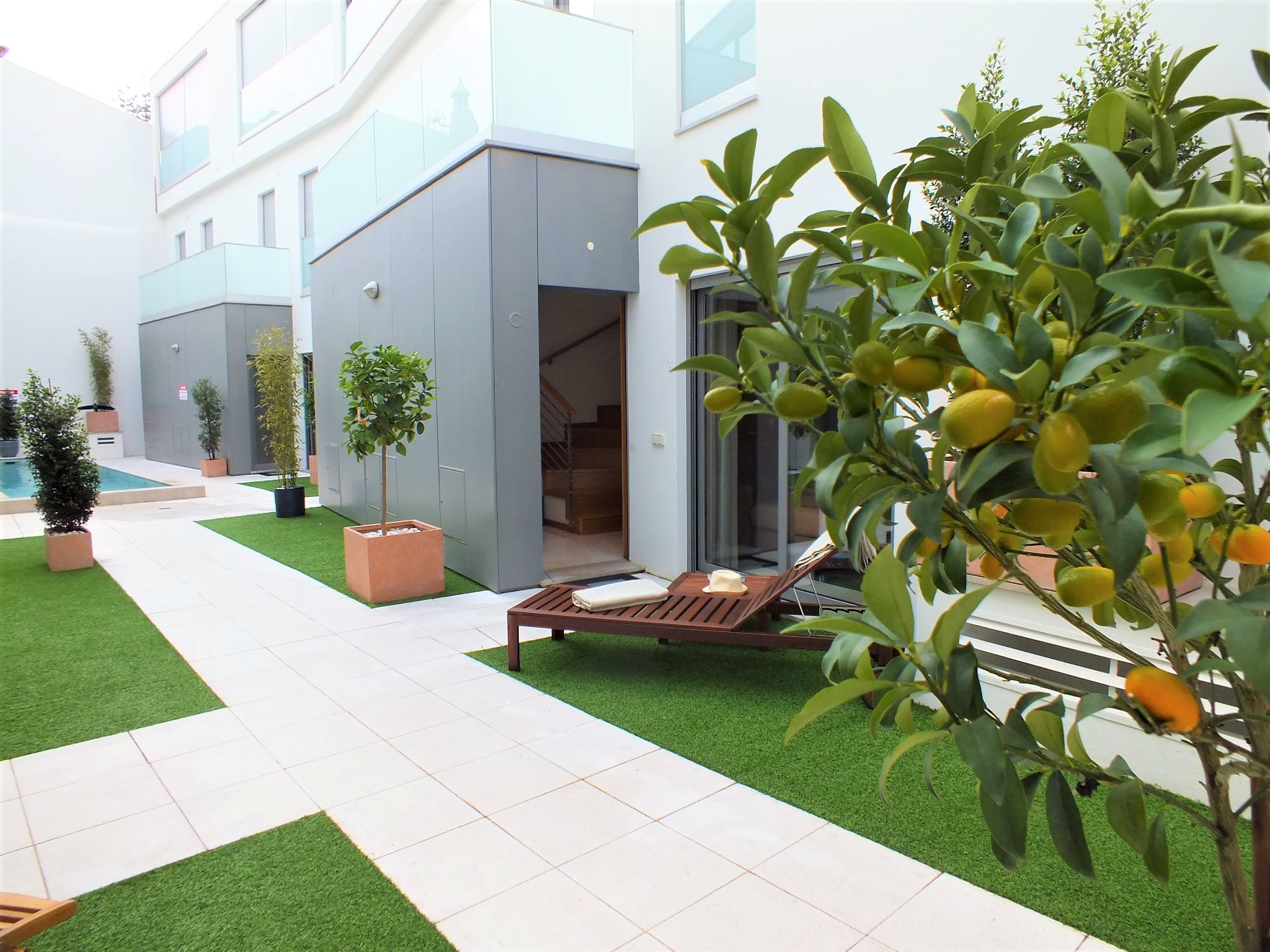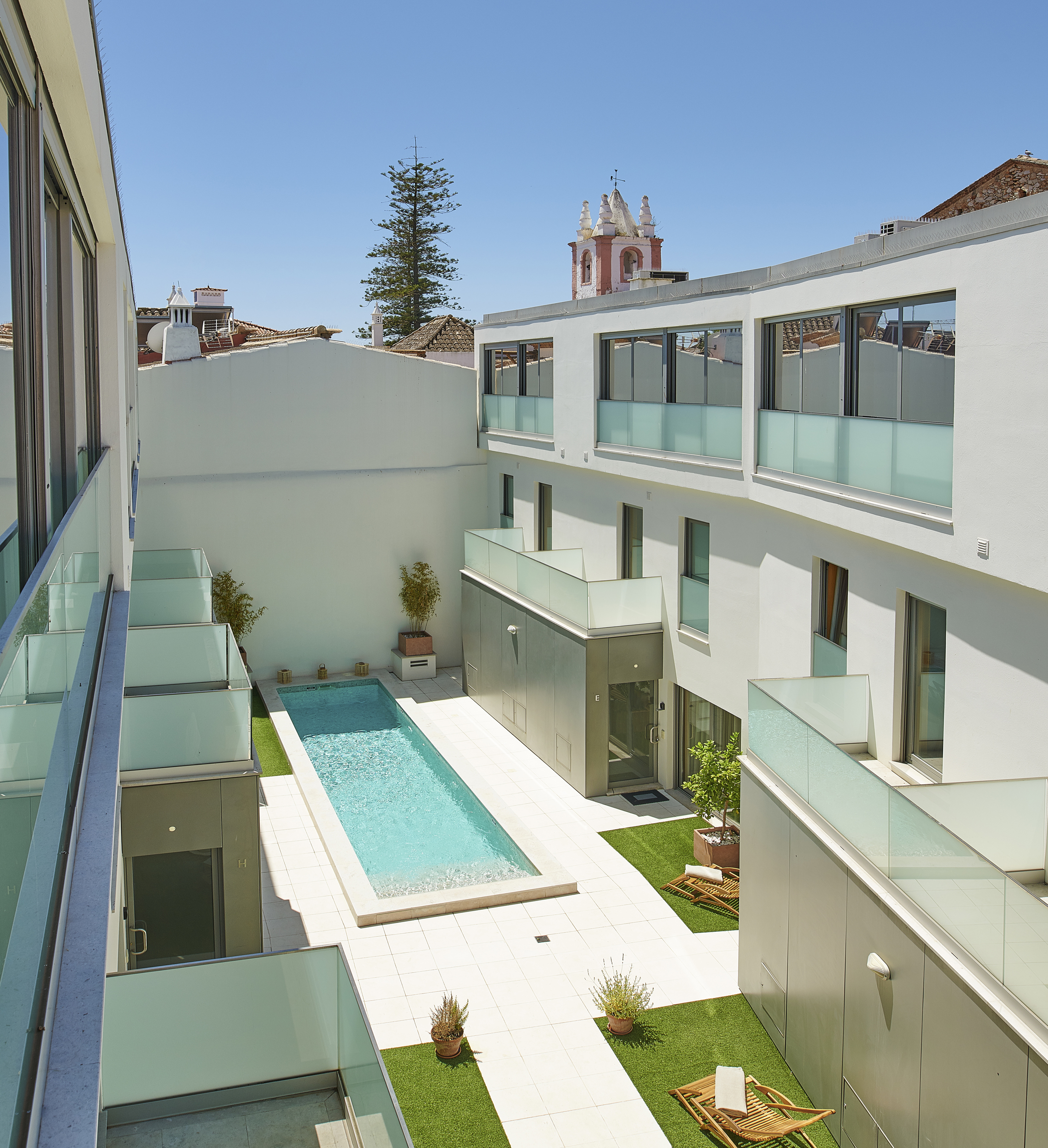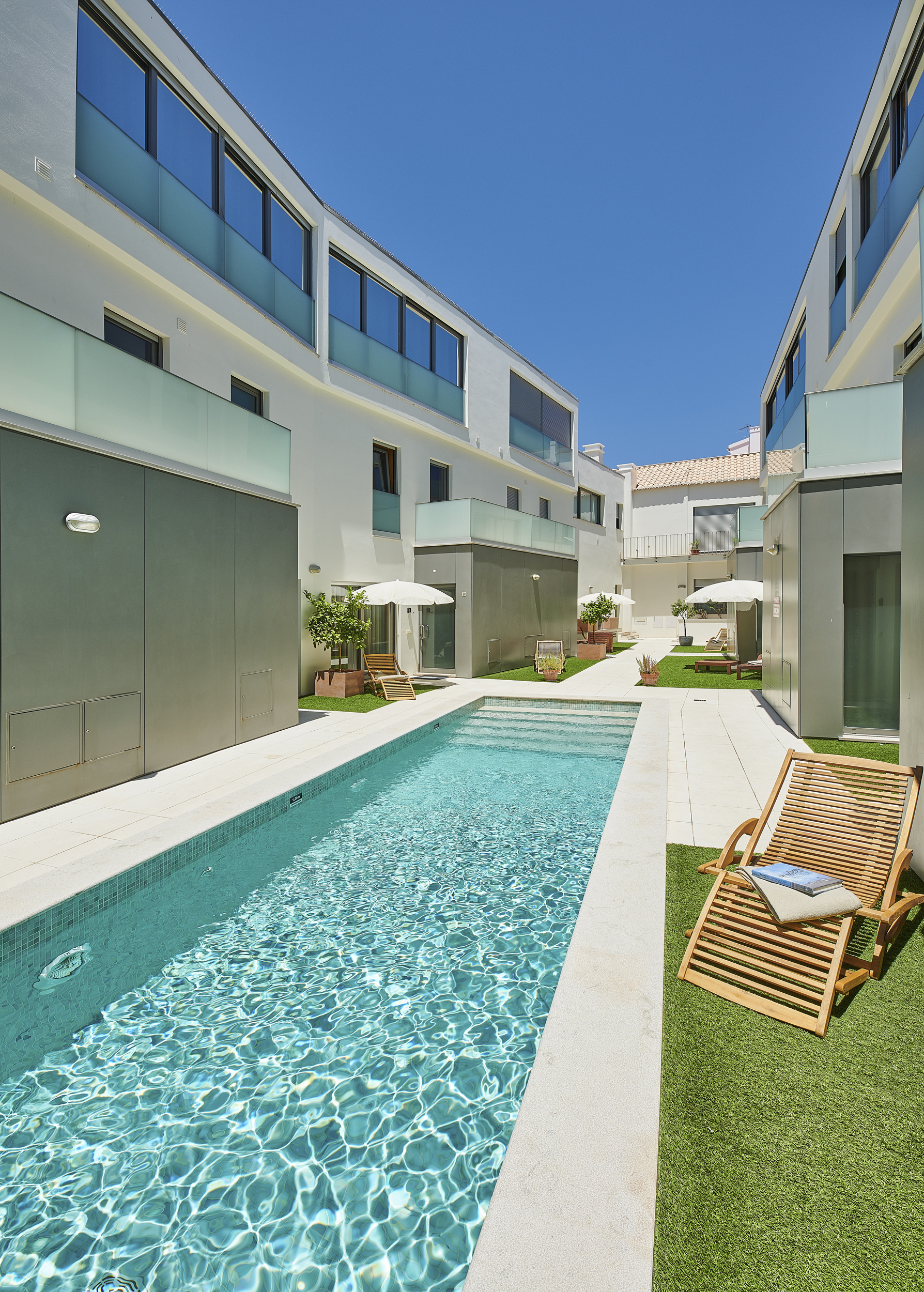 The apartments at Tavira City Suites have a very high standard and are located around a pleasant and quiet courtyard with a small exercise pool. All are duplex apartments on two or three floors (NB, no lift) with 2 bedrooms and 2 bathrooms, large living room and well-equipped kitchen. Balconies and patios are very small in this inner city accommodation. All apartments have a loft entrance, good Wi-Fi and international TV channels. Parking is available in the garage under the building and usually also on the small cul-de-sac right behind the accommodation.